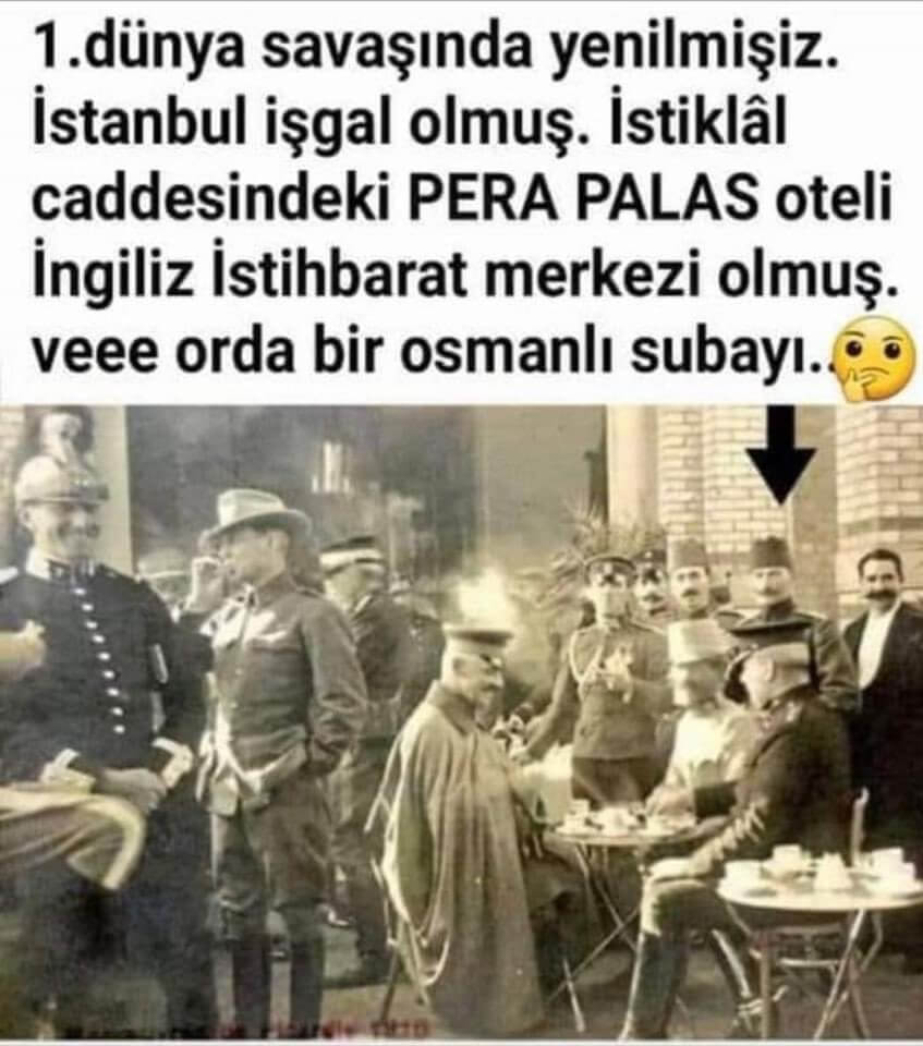 “1. dünya savaşında yenilmişiz. İstanbul işgal olmuş. İstiklâl caddesindeki Pera Palas oteli İngiliz İstihbarat merkezi olmuş vee orda bir osmanlı subayı. Sizce kim olabilir.??” notuyla paylaşılan görsel şöyle: