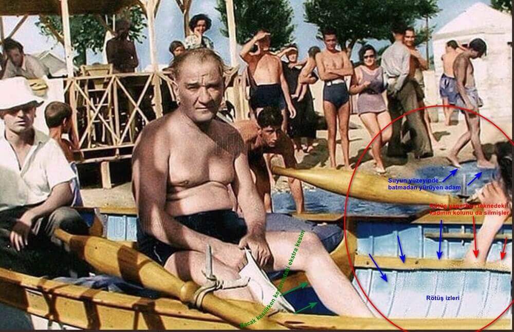 “1936, Mustafa Kemal Atatürk, Florya plajında halk ile beraber” notuyla sosyal medyada paylaşılan renkli fotoğrafın üzerindeki bazı hatalar, montaj içerdiği algısına yol açmış.