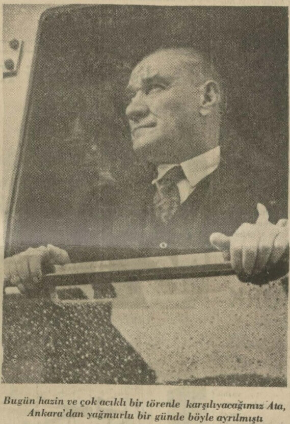 Atatürk’ün vefatının ardından naaşının cenaze töreni için Ankara’ya taşınmasını haberleştiren Ulus gazetesi, 20 Kasım 1937 günkü sayısında aynı tren penceresinden farklı bir fotoğrafı “Bugün hazin ve çok acıklı bir törenle karşılayacağımız Ata, Ankara’dan yağmurlu bir günde böyle ayrılmıştı.” cümlesiyle kullanmış.