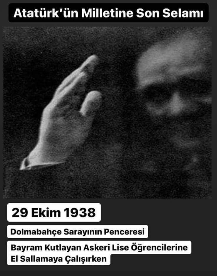 Türk Tarih Ocağı:“Atatürk’ün milletine son selamı29 Ekim 1938..Bayram kutlayan Askeri Lise öğrencilerine el sallarken.Dolmabahçe Sarayı’nın penceresi.”