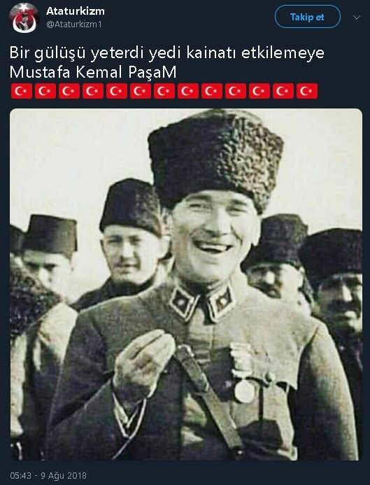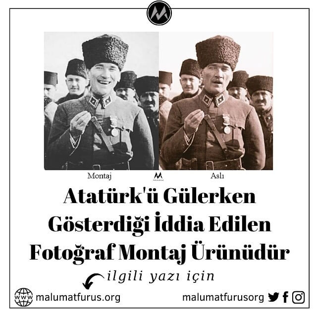 Sosyal medyada “Bir gülüşü yeterdi yedi kainatı etkilemeye Mustafa Kemal Paşam” notuyla Atatürk’ü gülerken gösterdiği iddia edilen bir fotoğrafın paylaşıldığı görülmekte: