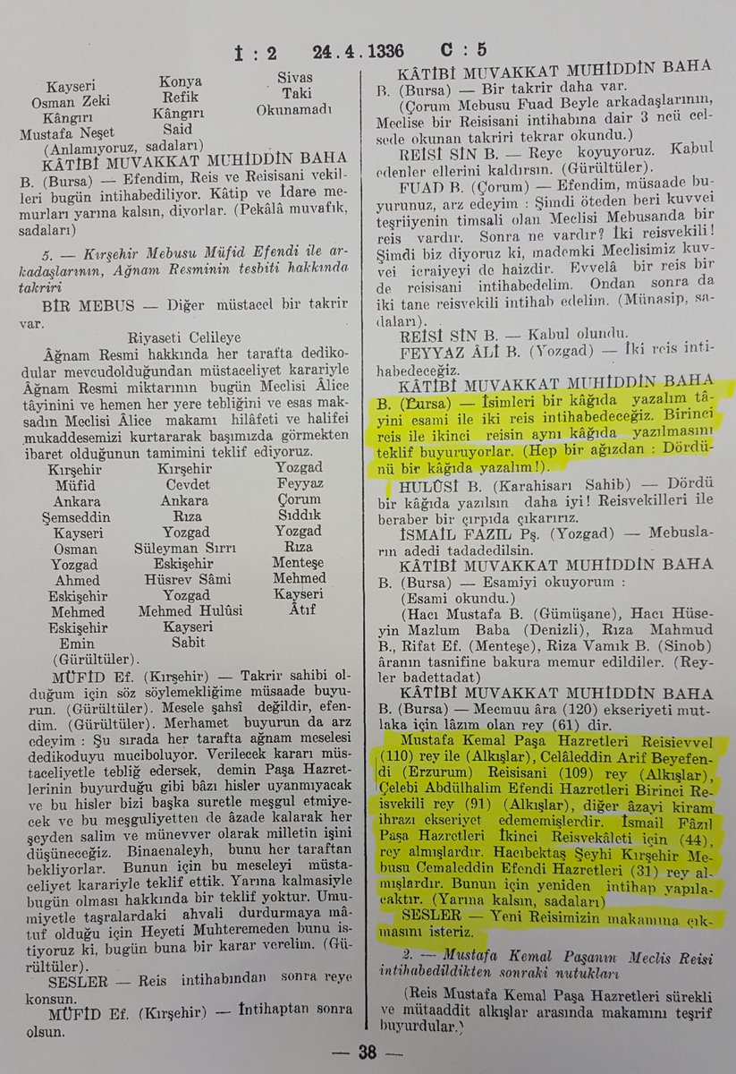 - Mustafa Kemal Atatürk’ün ismi Birinci Başkanlık için, Erzurum Mebusu Celaleddin Arif Bey’in ismi ise İkinci Başkanlık için yazılmıştır. Birinci Başkanlık için Atatürk’ten başka bir isim aday gösterilmemiştir. Dolayısıyla, Birinci Başkanlık için tek aday olan Atatürk’ün “farkla” kazanacağı bir seçim gerçekleşmemiştir. Meclis’in Birinci Başkanlığı için bir yarışma gerçekleşmemiştir.