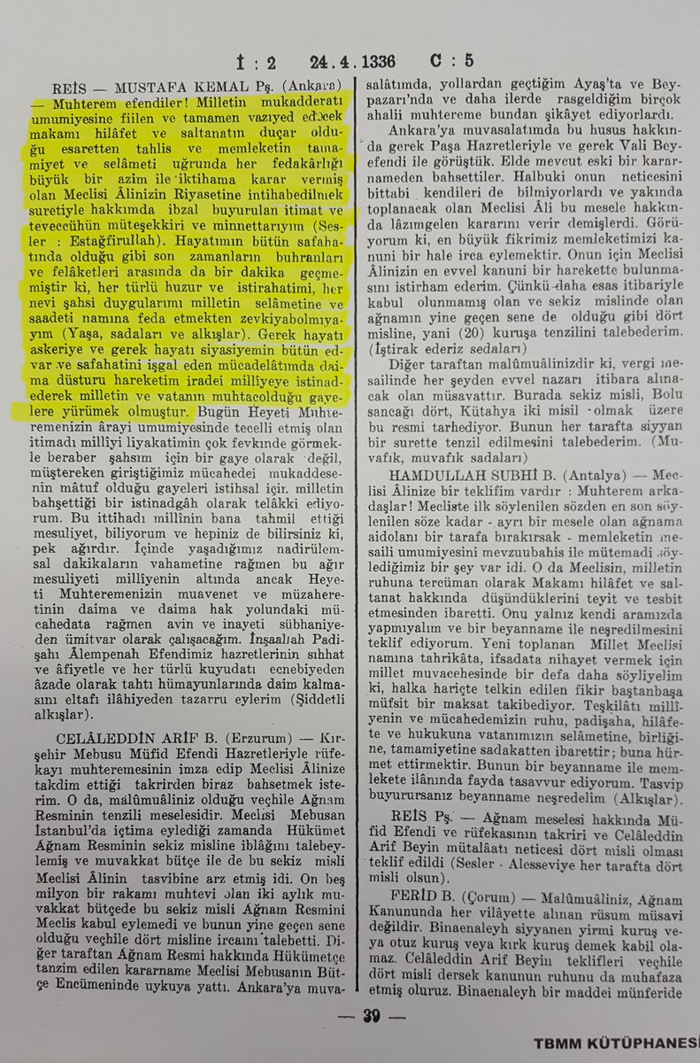 "24 Nisan günü Meclis başkanları seçiminde iki aday yarışır. Celaleddin Arif Efendi’nin aldığı 109 oya karşılık, Mustafa Kemal 110 oyla yani sadece 1 oy farkla başkan seçilir."