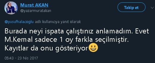 "Burada neyi ispata çalıştınız anlamadım. Evet M.Kemal sadece 1 oy farkla seçilmiştir. Kayıtlar da onu gösteriyor :)"