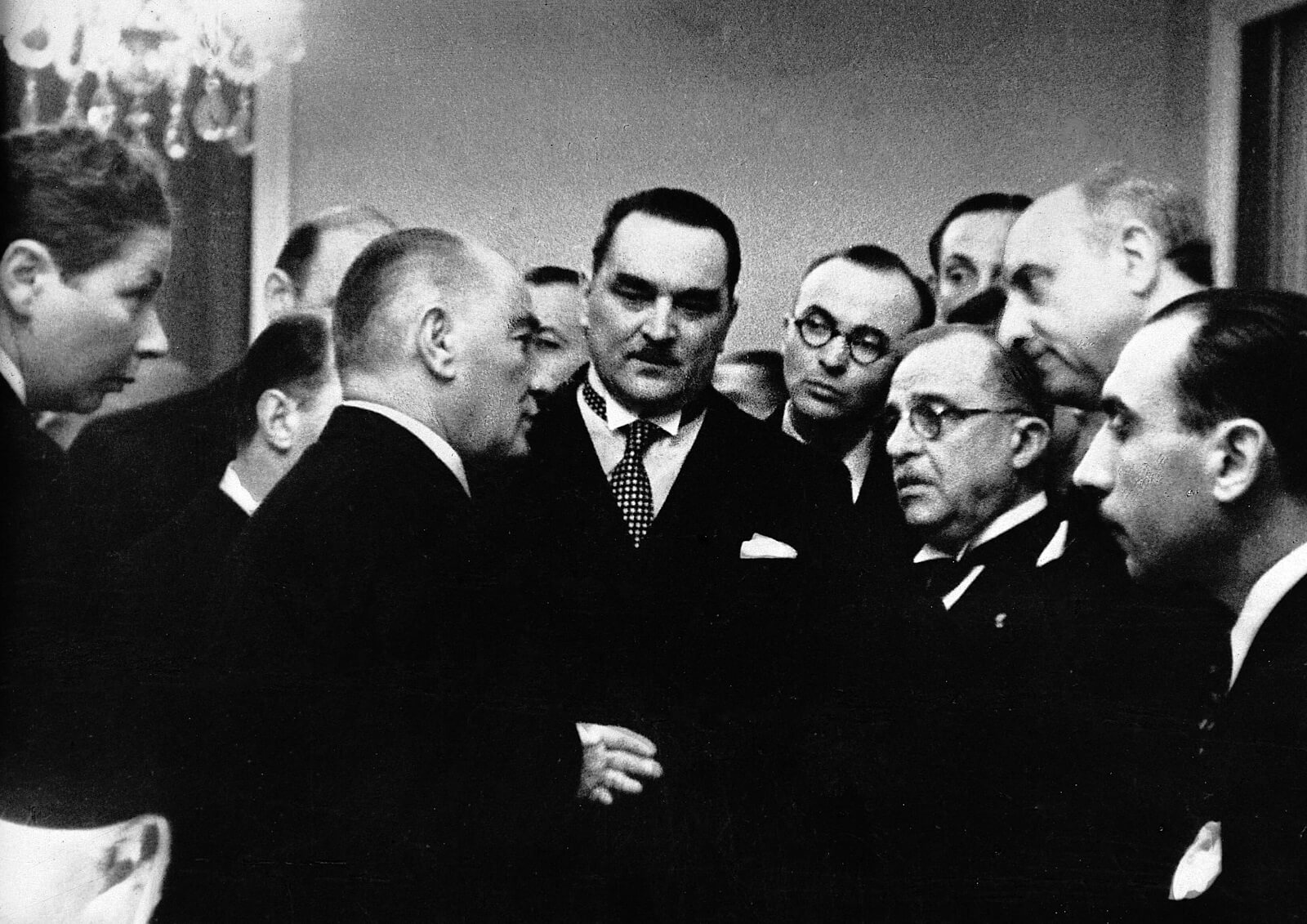 Atatürk, Balkan Antantı Konseyi Delegesi Yugoslavya Başbakanı Dr. Milan Stoyadinovitch ve Yunanistan Başbakanı İoannis Metaksas ile birlikte diğer delegelerle Çankaya Köşkü’nde sohbet ederken