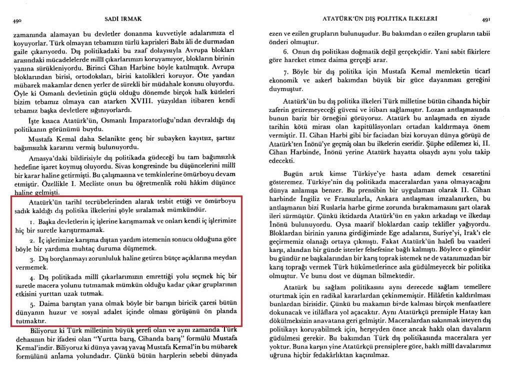 Ord. Prof. Dr. Sadi Irmak,  “Atatürk’ün Dış Politika İlkeleri” başlıklı makalesinde ((i) tam bağımsızlık, (ii) millet egemenliği ve (iii) kökten çağdaşlaşma başlıklarıyla özetlediği dünya görüşü çerçevesinde) Atatürk’ün -tarihî tecrübelerinden aldığı ilhamla tespit ettiğini ve bir ömür boyu sadık kaldığını belirttiği- dış politika ilkelerini kısaca şöyle sıralamıştı (Atatürk Araştırma Merkezi Dergisi. Sayı 9. Cilt III. Temmuz 1987):