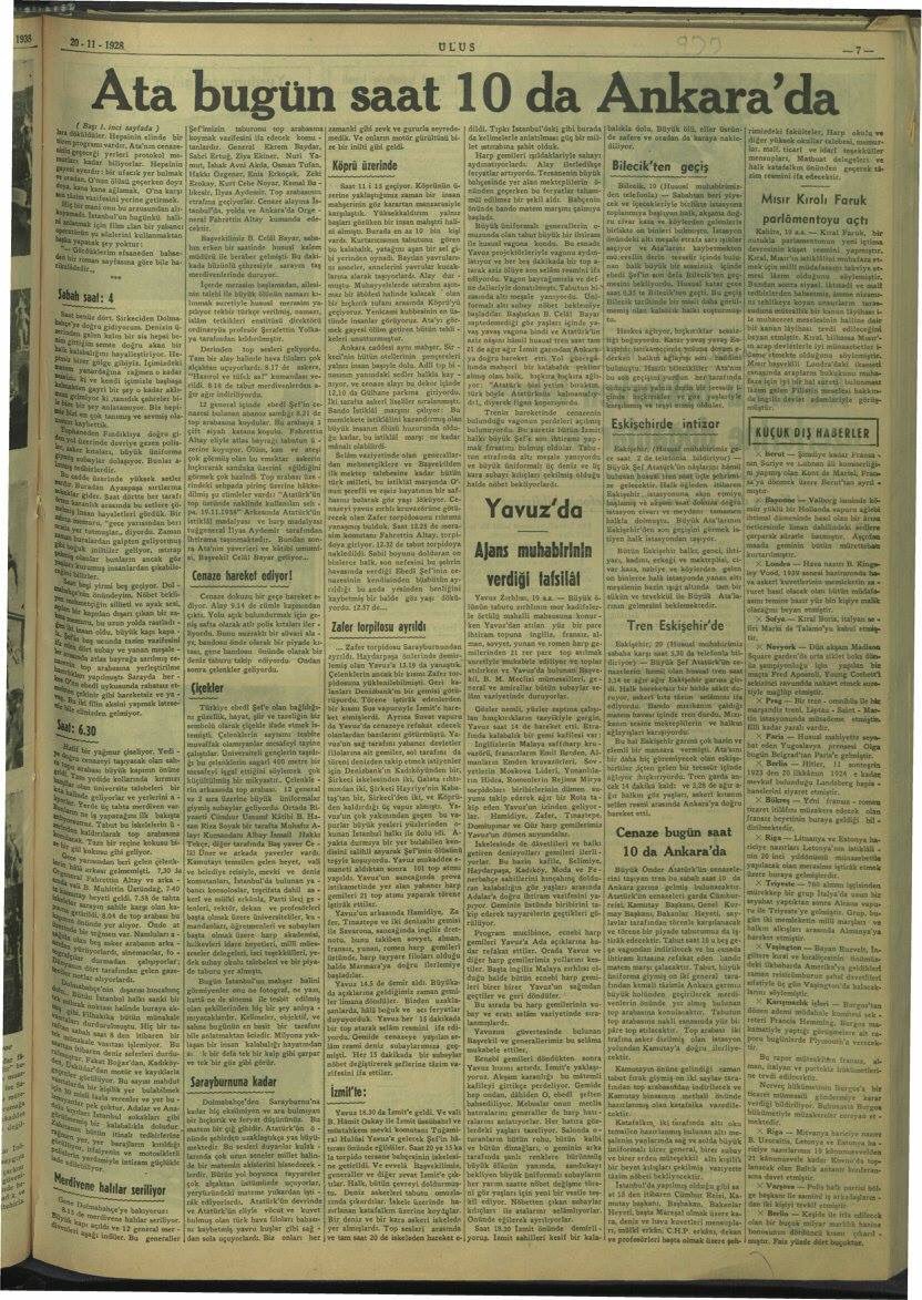 Ulus Gazetesi’nin 20 Kasım (Son Teşrin) 1938 tarihli baskısında millî yasın 11’inci gününde “Ata Bugün Ankarada” başlıklı “Bütün İstanbul büyük ölüyü çok içli bir törenle uğurladı” alt başlıklı birinci ve iç sayfalarında aktarılan haberde Atatürk’ün naaşının İstanbul’daki son anları ve Ankara’ya sevki süreci aktarılmıştır. 20 Kasım 1938 tarihli Ulus Gazetesi’nin 7. sayfasında yer alan Anadolu Ajansı muhabiri Cemal Kutay ve Neşet Atay’ın telefonla aktardığı haber metninde Atatürk’ün cenaze namazının “ailesinin talebi ile kılındığı” vurgulanarak şu bilgiler sunulmuştur: