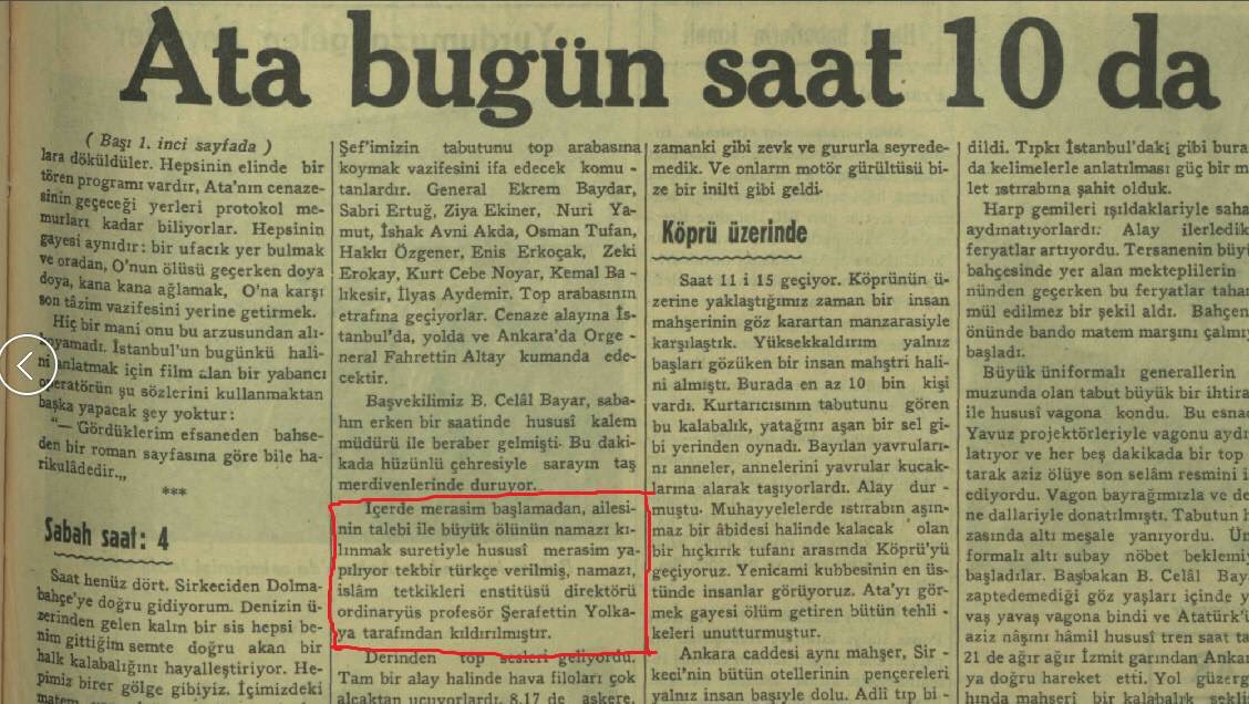 “İçerde merasim başlamadan, ailesinin talebi ile büyük ölünün namazı kılınmak suretiyle hususî merasim yapılıyor tekbir Türkçe verilmiş, namazı, İslâm Tetkikleri Enstitüsü Direktörü Ordinaryüs Profesör Şerafettin Yolkaya tarafından kıldırılmıştır.”