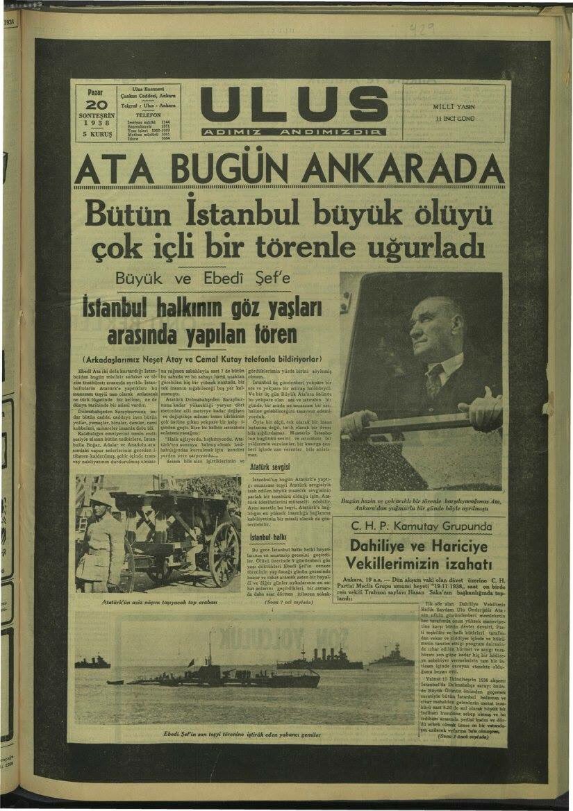 Ulus Gazetesi’nin Atatürk’ün naaşının İstanbul’dan ayrıldığı günün ertesi günü olan 20 Sonteşrin (Kasım) 1938 tarihli baskısında birinci ve iç sayfalarında aktarılan haberde Atatürk’ün naaşının İstanbul’daki son anları ve Ankara’ya sevki süreci aktarılmıştır. Ancak, gazete yer alan satırlarda İstanbul’da Eminönü Yeni Camii önünde bir tören düzenlendiğine dair bir atıf yer almamaktadır.