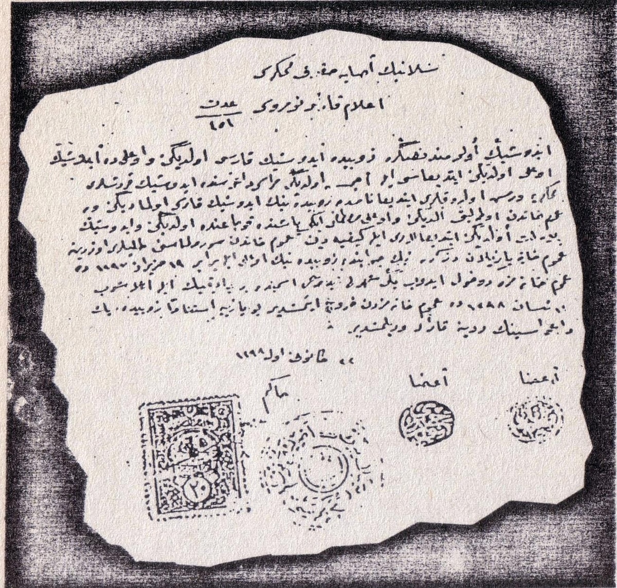 “Selanik Asliye Hukuk Mahkemesi İlâm karar numarası adet:451 tertip: 1 Cilt: 3 Düstur Cild-i salis Sayfa 302” kaynak atfıyla paylaşılan görsel, eski yazıyla imla hatalarını, günümüz Türkçesinden kelimeleri içerdiği, 1883 yılında mevcut olmayan Asliye Hukuk Mahkemesi’ne atıf yaptığı biliniyor.