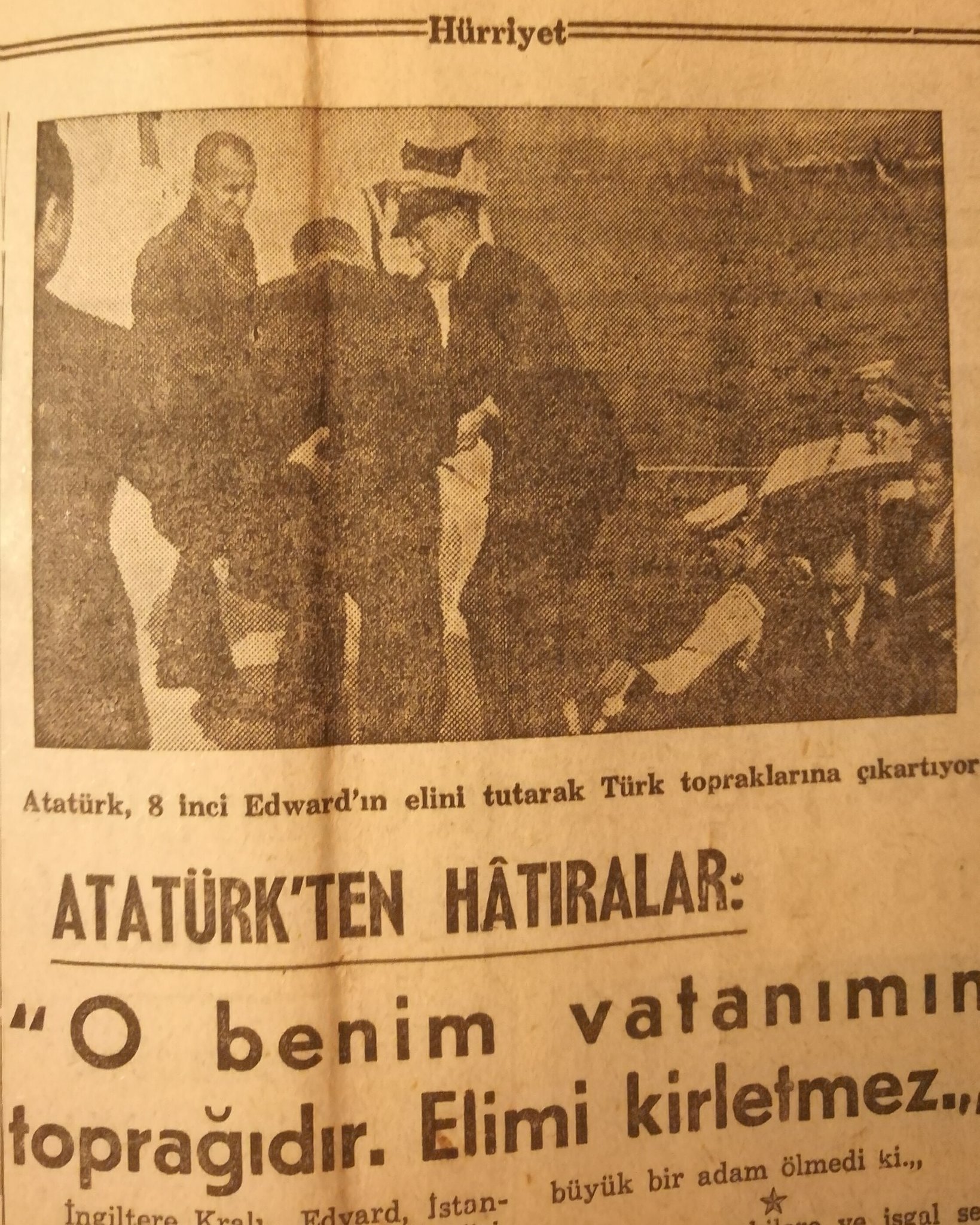 Kral Edward İstanbul’a geldiği zaman, yatından bir motora binerek Dolmabahçe Sarayı’na yanaştı. Atatürk rıhtımda O’nu bekliyordu. Deniz dalgalı idi ve kralın bindiği motor inip çıkıyordu. Kral rıhtıma çıkmak istediği bir sırada eli yere değdi ve tozlandı. O sırada Atatürk de Kral’ı rıhtıma almak üzere elini uzatmış bulunuyordu. Bunu gören kral bir mendille elini silmek istediği bir anda Atatürk: