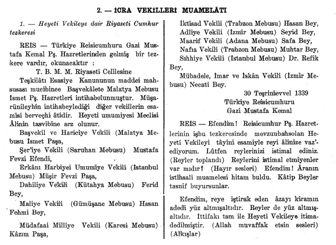 29 Ekim 1923 Pazartesi saat 18.00’de İsmet İnönü başkanlığında toplanan TBMM’ye sunulan Cumhuriyetimizin ilânına dair Anayasa değişikliği tasarısı saat 20:30’da yapılan oylamada oturuma katılan 158 vekilin tamamının oyuyla kabul edilmişti. Akabinde yapılan oylamada Mustafa Kemal Atatürk, TBMM tarafından yeni Türk devletinin ilk cumhurbaşkanı seçilmişti. Cumhurbaşkanı seçilen Atatürk , hemen o akşam İsmet İnönü’ye Başbakanlık görevini vermişti. İsmet İnönü de kabinesini oluşturmuştu. 30 Ekim 1923’te “Türkiye Reisicumhuru Gazi Mustafa Kemal” imzasıyla TBMM Riyaseti Celilesine tezkere ile gönderilen ilk kabine listesi 30 Ekim 1923 günü TBMM’de güvenoyu almıştı.