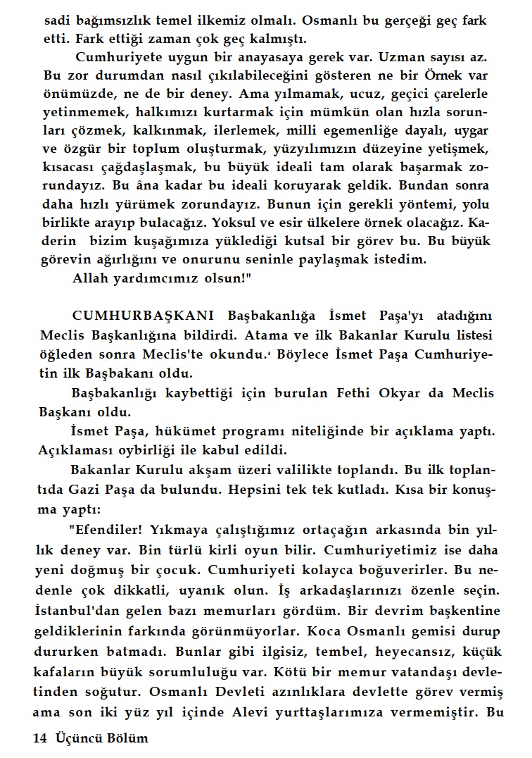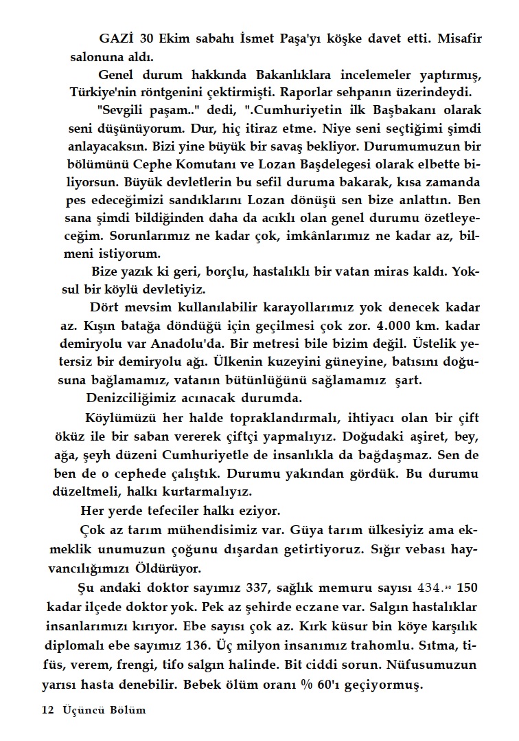“Sevgili paşam..” dedi, “.Cumhuriyetin ilk Başbakanı olarak seni düşünüyorum. Dur, hiç itiraz etme. Niye seni seçtiğimi şimdi anlayacaksın. Bizi yine büyük bir savaş bekliyor. Durumumuzun bir bölümünü Cephe Komutanı ve Lozan Başdelegesi olarak elbette biliyorsun. Büyük devletlerin bu sefil duruma bakarak, kısa zamanda pes edeceğimizi sandıklarını Lozan dönüşü sen bize anlattın. Ben sana şimdi bildiğinden daha da acıklı olan genel durumu özetleyeceğim. Sorunlarımız ne kadar çok, imkânlarımız ne kadar az, bilmeni istiyorum.