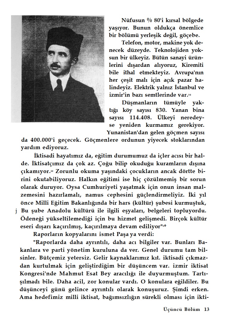 “Raporlarda daha ayrıntılı, daha acı bilgiler var. Bunları Bakanlara ve parti yönetim kuruluna da ver. Genel durumu tam bilsinler. Bütçemiz yetersiz. Gelir kaynaklarımız kıt. iktisadi çıkmazdan kurtulmak için geliştirdiğim bir düşüncem var. İzmir iktisat Kongresi’nde Mahmut Esat Bey aracılığı ile duyurmuştum. Tartışılmadı bile. Daha acil, zor konular vardı. O konulara eğildiler. Bu düşünceyi günü gelince ayrıntılı olarak konuşuruz. Şimdi erken. Ama hedefimiz milli iktisat, bağımsızlığın sürekli olması için iktisadi bağımsızlık temel ilkemiz olmalı. Osmanlı bu gerçeği geç fark etti. Fark ettiği zaman çok geç kalmıştı.