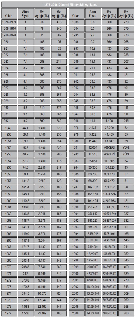 1876-2006 yılları arasındaki 230 yıllık sürede mebusların yalın maaşları ile ödenek ve yolluklarını içeren toplam maaşlarına ilişkin tablo şu şekildedir: