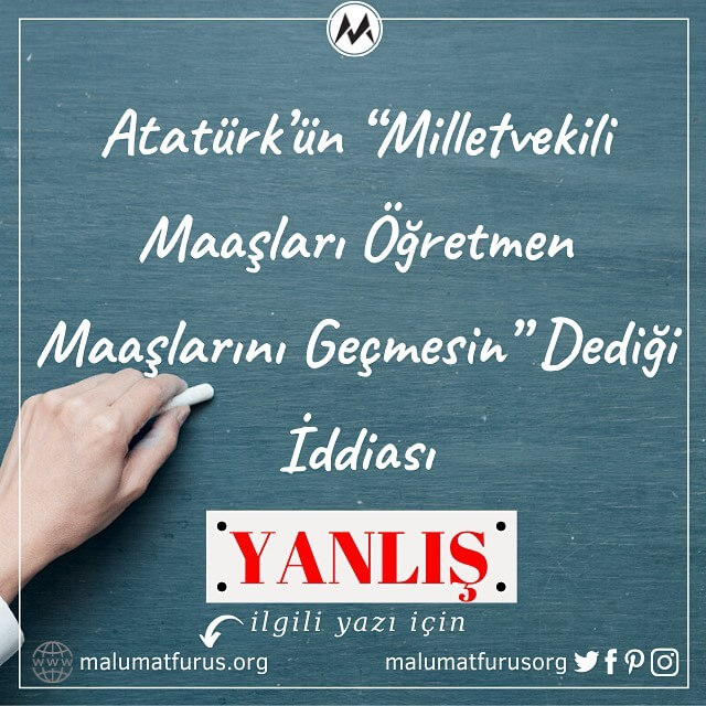 Mustafa Kemal Atatürk’ün milletvekili maaşlarının öğretmen maaşlarından fazla olmamasını istediği iddiası Malumatfuruş’ta incelediğimiz diğer şehir efsaneleriyle aynı özelliklere sahip: Kaynağı belirsiz, doğrulanamıyor, politik güdüyle paylaşılıyor ve özellikle maaş kıyaslaması hakkında yanlış unsurlar içeriyor.