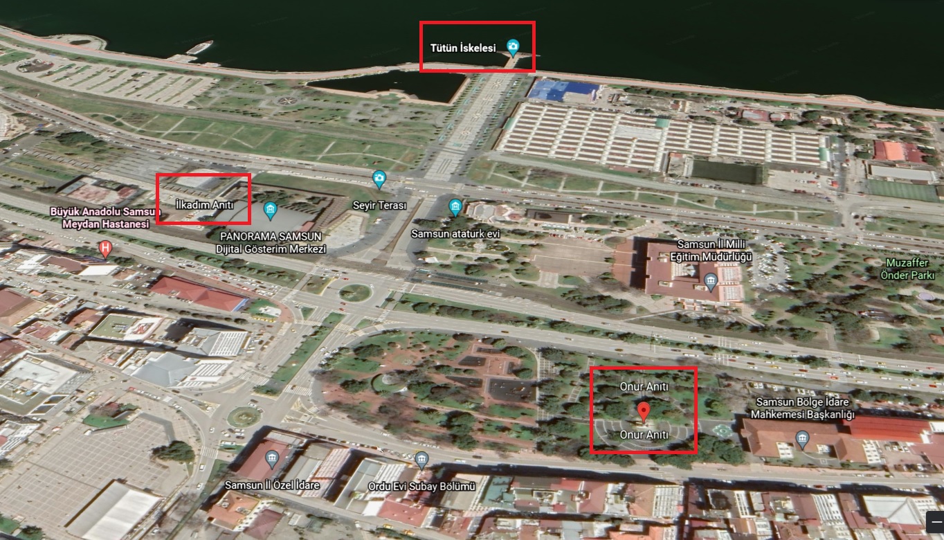 Onur Anıtı’nın, İlk Adım Anıtı’nın ve Tütün İskelesi’nin konumları harita üzerinde şu şekilde aktarılabilir: