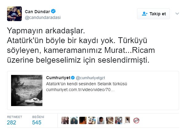 Can Dündar, “Atatürk’ün kendi sesinden Selanik türküsü” notuyla paylaşılan kayıt hakkında şu yorumda bulunmuştu: