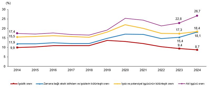 | Yıllar | İşsizlik oranı | Zamana bağlı eksik istihdam ve işsizlerin bütünleşik oranı | İşsiz ve potansiyel işgücünün bütünleşik oranı | Atıl işgücü oranı |