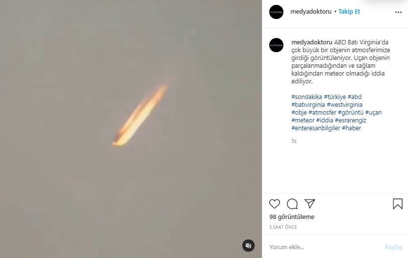 Bahsi geçen videoyu sosyal medyada “ABD Batı Virginia’da çok büyük bir objenin atmosferimize girdiği görüntüleniyor. Uçan objenin parçalanmadığından ve sağlam kaldığından meteor olmadığı iddia ediliyor.” aktaran paylaşımlardan bir örnek şu şekildeydi: