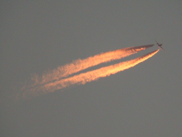 Uçakların motorlarından çıkan havada bulunan su buharının bir anda soğuyup yoğunlaşmasıyla oluşan izlerin güneş doğarken ve batarken kızıl renk alabildiği biliniyor.