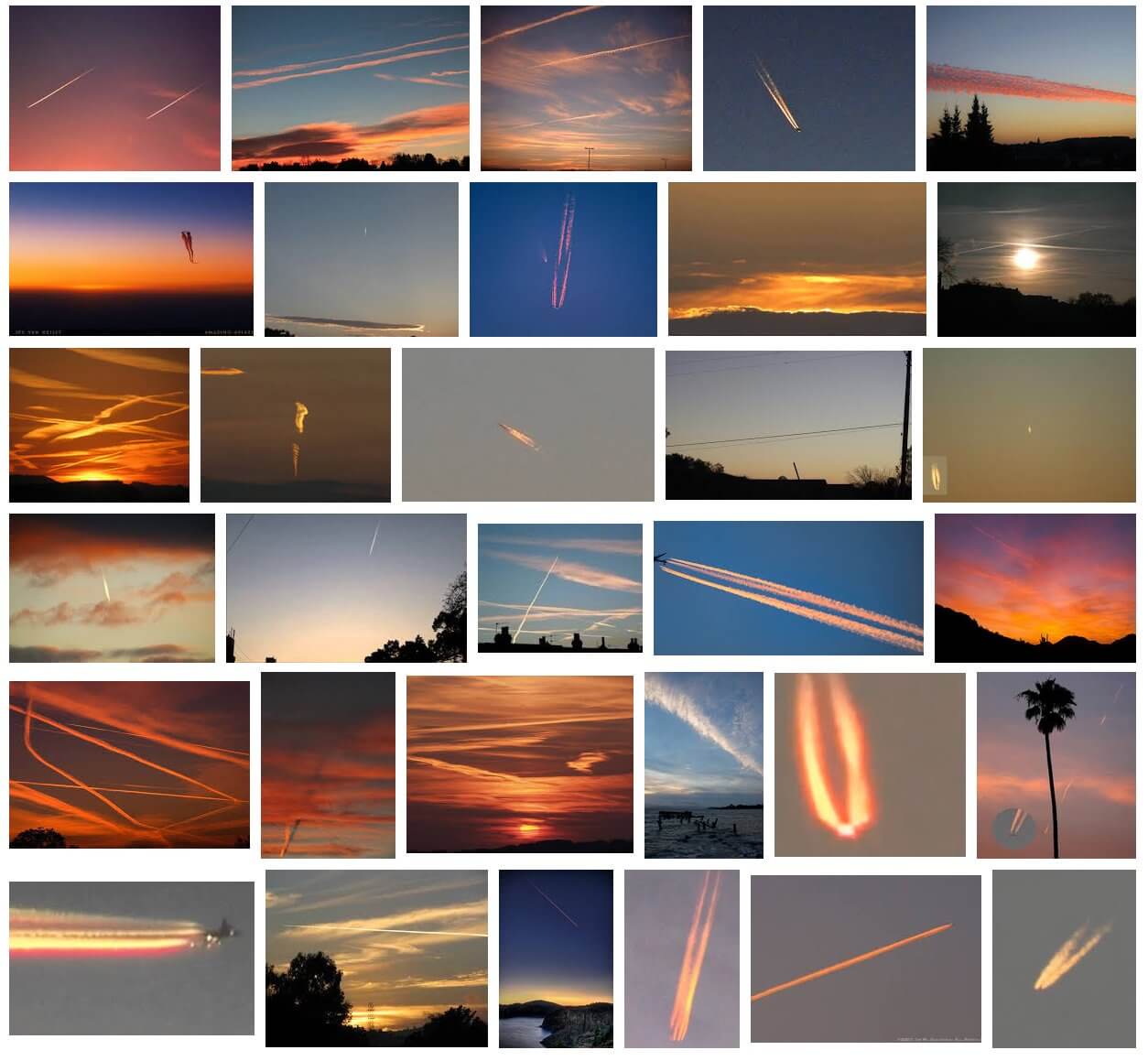 Yüksek irtifada uçakların ardında bıraktığı bulutumsu bu doğrusal izlerin gün batımı ve gün doğumunda, güneş ışığı nedeniyle kırmızı, turuncu ve sarı gibi sıcak tonlarda görüntülendiği birçok örnek görsel sunulabilir.