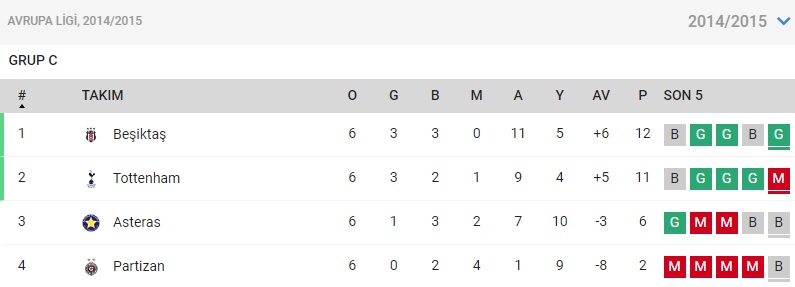 Beşiktaş da 2014-2015 sezonunda Avrupa Ligi C Grubu‘nu namağlup tamamlamıştı.