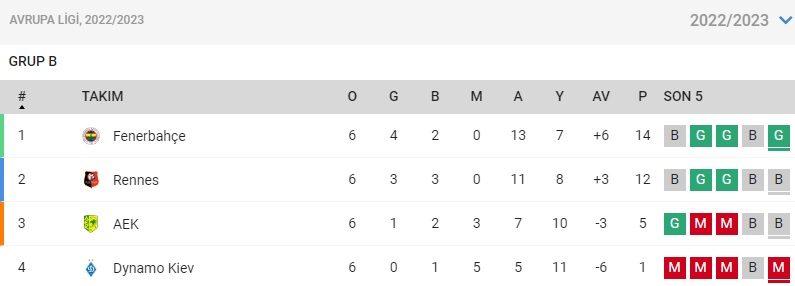 Fenerbahçe, 2022-2023 sezonunda Avrupa Ligi B Grubu‘nda oynadığı 6 maçın 4’ünde galibiyet, 2’sinde ise beraberlik elde ederek namağlup lider olarak gruptan çıkmayı başardı.