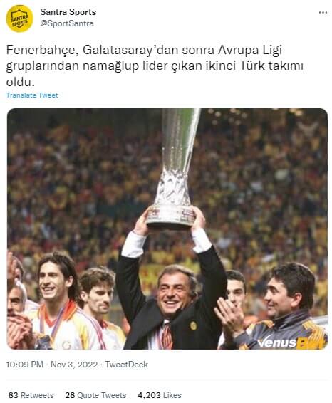 Bu başarılı performansın ardından Fenerbahçe’nin Galatasaray’dan sonra Avrupa Ligi gruplarından namağlup lider çıkan ikinci Türk takımı olduğu yönündeki yanlış iddianın sosyal medyada paylaşıldığı görüldü.