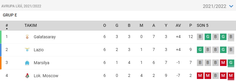 2021-2022 sezonunda UEFA Avrupa Ligi E Grubu‘nda oynadığı 6 maçta da yenilgi almayan Galatasaray lider olarak tur atlamıştı.