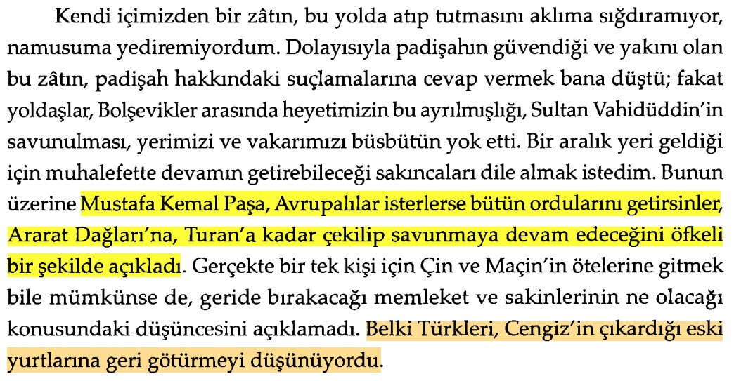 “… Onun adına devlet işlerini yönetmekte ve yine toplandığımız o masa etrafında onun adına müzakere etmekteydik. Anadolu’da padişah hakkında bir kırgınlık bulunmaktaysa da, daha açığa vurulmamış, hele hilâfet ve saltanat makamı tasdik edildikten başka, halen gösterilmekte olan çaba, o yüksek makamın kurtarılması amacına dayandırılmaktaydı.Kendi içimizden bir zâtın, bu yolda atıp tutmasını aklıma sığdıramıyor, namusuma yediremiyordum. Dolayısıyla padişahın güvendiği ve yakını olan bu zâtın, padişah hakkındaki suçlamalarına cevap vermek bana düştü; fakat yoldaşlar, Bolşevikler arasında heyetimizin bu ayrılmışlığı, Sultan Vahidüddin’in savunulması, yerimizi ve vakarımızı büsbütün yok etti. Bir aralık yeri geldiği için muhalefette devamın getirebileceği sakıncaları dile almak istedim. Bunun üzerine Mustafa Kemal Paşa, Avrupalılar isterlerse bütün ordularını getirsinler, Ararat Dağları’na, Turan’a kadar çekilip savunmaya devam edeceğini öfkeli bir şekilde açıkladı. Gerçekte bir tek kişi için Çin ve Maçin’in ötelerine gitmek bile mümkünse de, geride bırakacağı memleket ve sakinlerinin ne olacağı konusundaki düşüncesini açıklamadı. Belki Türkleri, Cengiz’in çıkardığı eski yurtlarına geri götürmeyi düşünüyordu.Paşa yine münasebet getirerek Salih Paşa’nın Amasya mülakatında, arkadaşlarını meclisin İstanbul dışında bir yerde toplanmasına ikna edemezse, istifa edeceği sözü verdiği halde sözünü tutmaması dolayısıyla bu zâtı suçladı. Halbuki daha sonra kendisi de meclisin İstanbul’da toplanmasına razı olduğuna göre, Salih Paşa’yı suçlamaya gerek yoktu. Nihayet kendi arkadaşlarıyla diğer bir odada müzakere etmek için bu oturuma son verildi. Geri döndükten sonra meseleyi gereği gibi araştırmak için Ankara’ya gitmemizi teklif etti.Mustafa Kemal Paşa’nın kesinlikle uzlaşma yanlısı olmadığı, bu konuşmada olanca açıklığıyla ortaya çıktı. Bütün komedya, hakkımızdaki gizli niyetini uygulamak için bazı sebepler bulmak, taruklar göstermek için hazırlanmak maksadına dayanıyordu. Hatta müzakere esnasında Ferit Paşa hükümetinin kendi işine daha çok yaradığını, çünkü onun hakkındaki genel nefretin kendileri için kuvvet, İstanbul’da halkın güvenini kazanmış kimselerin kabine kurmasının ise zayıflık olduğunu açıkça ifade etmişti.Giderken, İsmet Paşa kendi vagonunu benimle Salih Paşa’ya vermişti. Halinde iztırap ve telaş izleri görülmekteydi. Kendisi Batı Cephesi Kumandanı olduğu için, karargah edindiği Eskişehir’de kaldı. Bu aralık Bolşeviklerin Kafkasya’da Gümrü (Aleksandropol) taraflarında yığınak yaptıkları ihbar edildi. …”