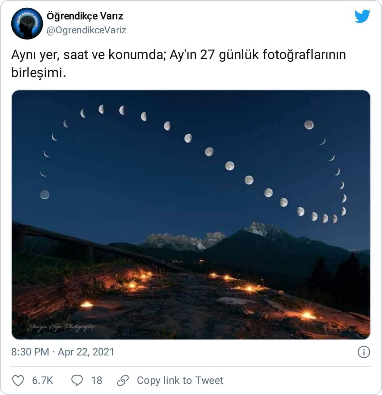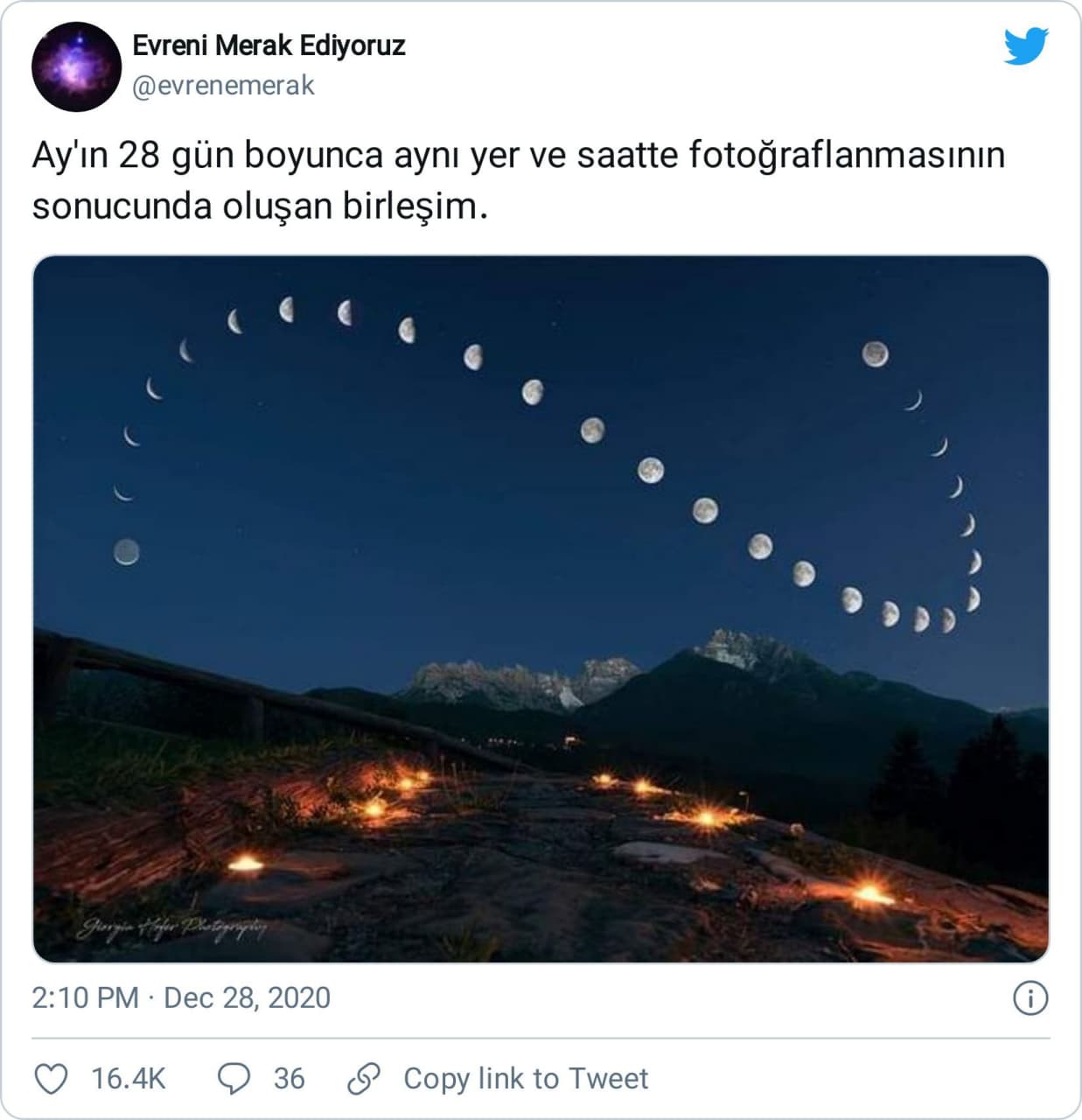“Aynı yer, saat ve konumda; Ay’ın 27 günlük fotoğraflarının birleşimi” ya da “Ay’ın 28 gün boyunca aynı yer ve saatte fotoğraflanmasının sonucunda oluşan birleşim” gibi notlarla paylaşılan aşağıdaki görsele değineceğiz…