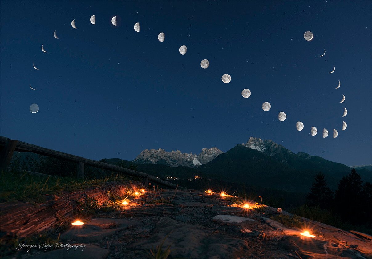 “In this composite image I wanted to represent the position and the changing phases of the Moon above the peaks of the Cridola Group, in Italy, during a lunar month, called synodic month. With an astronomical software I calculated for 27 days the position of the Moon every 1481 minutes (24 hours and 41 minutes), but for the capture of all the lunar phases I spent a whole year because the weather, in my country, is almost always unfavorable. The moons in the waning phase, on the left, were captured in January 2017 while the moons in the growing phase, on the right, between the month of July 2017 and December 2017. To photograph the moon I used a 400mm telephoto lens Author: Giorgia Hofer www.giorgiahoferphotography.com for the landscape Nikon D750, Nikkor 20 mm Exp. 8 sec, iso 800, f/8. from Lozzo di Cadore.- Belluno-Italy for the Moon :Nikon D750, Sigma 120/400 mm”