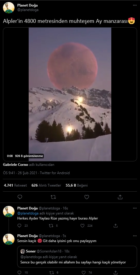 “Alpler’in 4800 metresinden muhteşem Ay manzarası” notuyla bahse konu görüntüyü içeren örnek paylaşım şu şekilde: