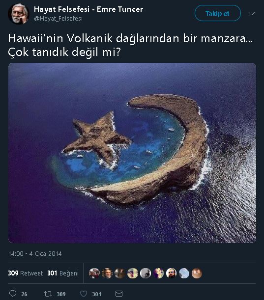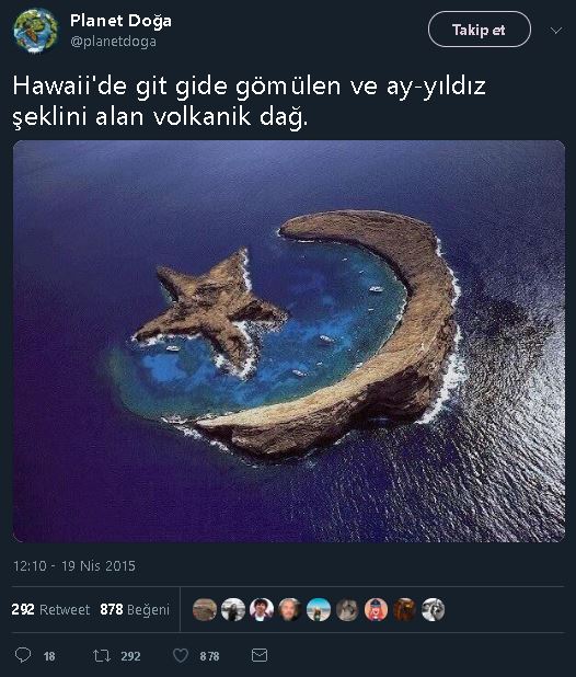 2000’lerin başında e-posta gruplarında dolaşan “ay yıldız şeklindeki ada”ya ait olduğu iddiasıyla paylaşılan görseli tevellüdü yetenler hatırlayacaktır. Bahsi geçen e-posta gruplarının popüler olduğu zamana yetişememiş olsanız da, sosyal medyada “Hawaii’de git gide gömülen ve ay-yıldız şeklini alan volkanik dağ“, “Hawaii’nin Volkanik dağlarından bir manzara… Çok tanıdık değil mi?” gibi notlarla paylaşılan ay-yıldız şeklinde olduğu öne sürülen adaya mutlaka denk gelmişsinizdir…