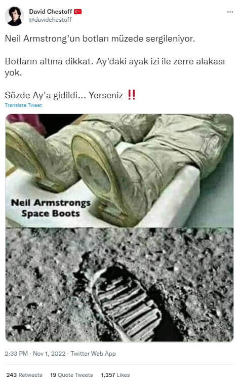 16 Temmuz 1969’de Dünya’dan ayrıldıktan sonra 20 Temmuz 1969 günü Ay’a ayak basan Apollo 11 astronotlarının uydumuzun yüzeyinde bıraktıkları ayak izlerinin giydikleri ayakkabıları ile uyuşmadığı yönündeki asılsız iddiayı aktaran paylaşım örneği şöyle: