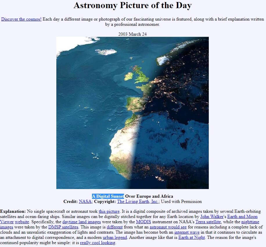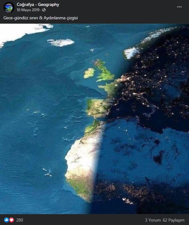 Ancak paylaşılan görsel, Batı Avrupa ve Batı Afrika üzerinden gündüzden geceye geçişi gösteren aydınlanma çizgisinin uzaydan görüntüsü değil. Gündüzü geceden ayıran aydınlanma / gün batımı çizgisinin görüntülendiği sanılan bahse konu görsel, birden fazla uydudan alınan farklı fotoğrafların (The Living Earth girişimi tarafından Earth and Moon Viewer vasıtasıyla) bilgisayar ortamında birleştirilmesiyle oluşturulmuş.