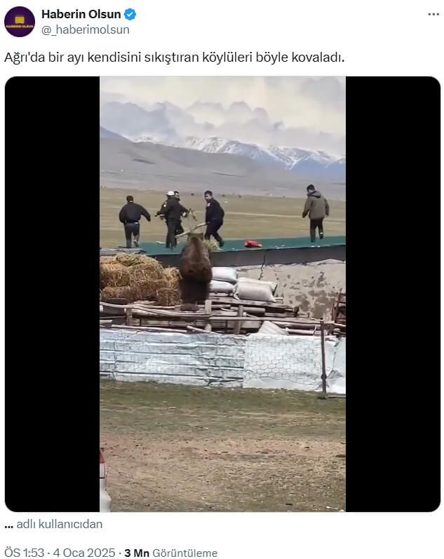 Haberin Olsun (@_haberimolsun) & Gazete 360 (@360Gazete) &  Odak TV (@OdakTV1) & mühendisyen (@muhendisyenn): “Ağrı’da bir ayı kendisini sıkıştıran köylüleri böyle kovaladı.”