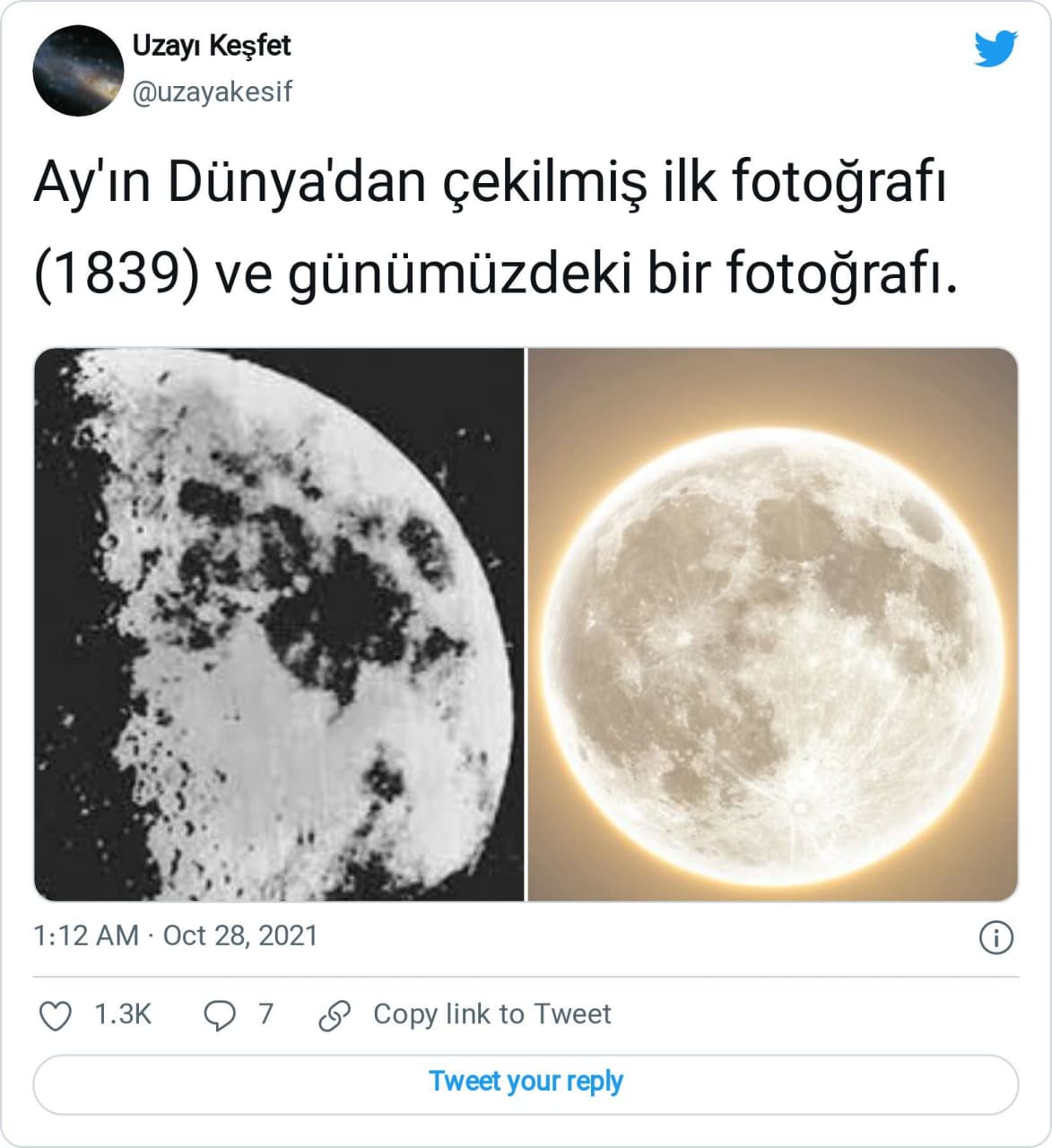 “Ay’ın Dünya’dan çekilmiş ilk fotoğrafı (1839) ve günümüzdeki bir fotoğrafı.”