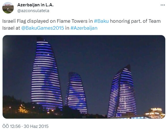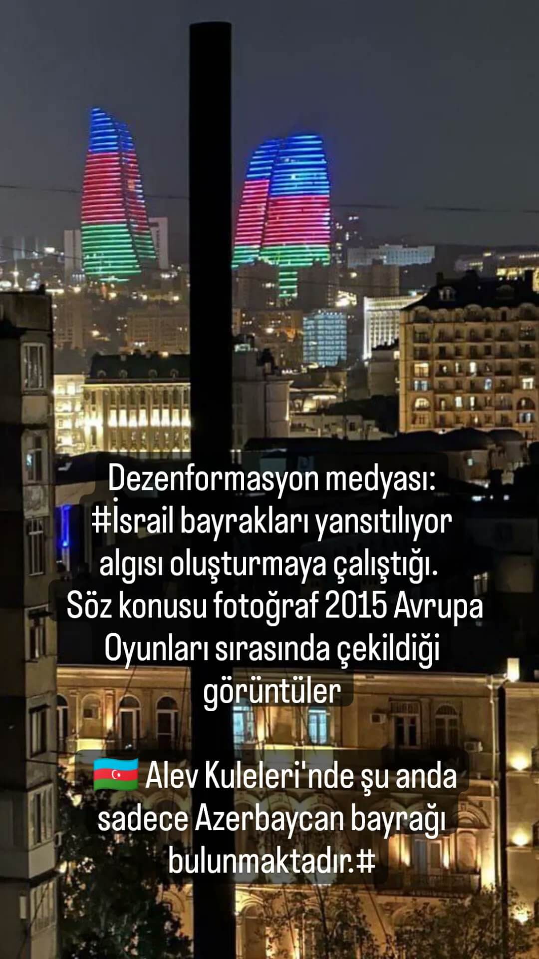 Azerbaycan’dan sosyal medya kullanıcıları da Bakü’deki Alev Kuleleri’nin son görüntülerini paylaşarak binalara İsrail değil kendi ülkelerinin bayrağının yansıtıldığını beyan etti.