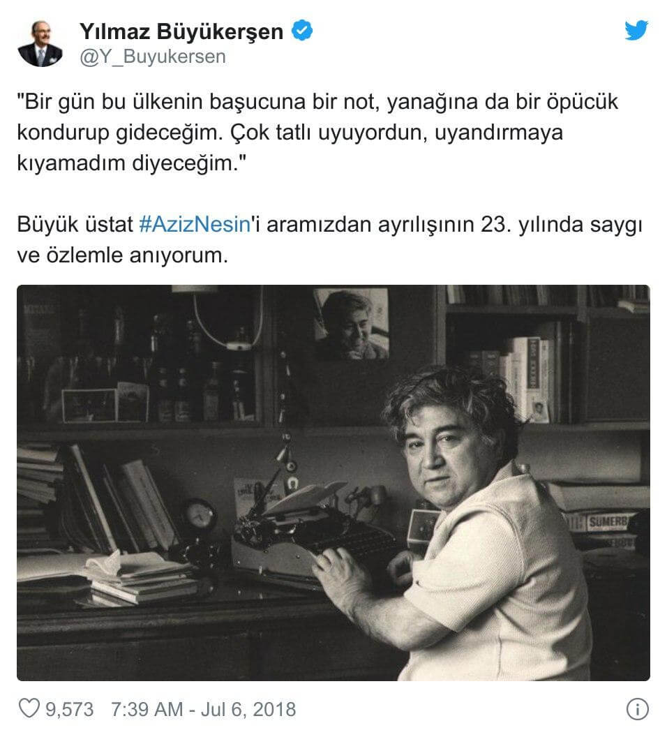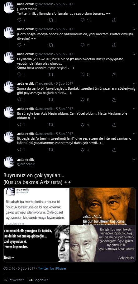 “Twitter’ın ilk yıllarında aforizmalar vs yazıyordum buraya (Gerçi sosyal medya öncesi de yazıyordum da, yeni mecram Twitter omuştu diyeyim) O yıllarda (2009-2010) birisi bir başkasının tweetini izinsiz copy-paste yaptığında falan olay olurdu.. Sonra hızla anonimleşme başladı. Sonra da garip bir furya başladı.. Burdaki tweetleri ünlü yazarların sözleriymiş gibi paylaşmaya başladı birileri.. Bu süreçte ben Aziz Nesin oldum, Can Yücel oldum.. Hatta Mevlana bile oldum 🙂 İlk başlarda “o benim tweetimdi lan?” diye ses etsem de internet camiası o lafları ünlü yazarlarınmış zannetmeyi daha çok sevdi.. Buyrunuz en çok yayılanı.. (Kusura bakma Aziz usta) Bu lafı Aziz Nesin’den çalmışsın diye durduk yerde bana kızanlar oluyordu hatta ara ara :)”
