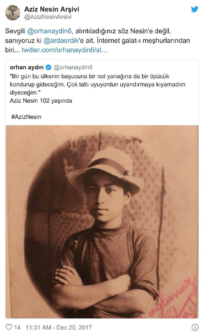 “Sevgili @orhanaydin6 , alıntıladığınız söz Nesin’e değil, sanıyoruz ki @ardaerdik ‘e ait. İnternet galat-ı meşhurlarından biri…”