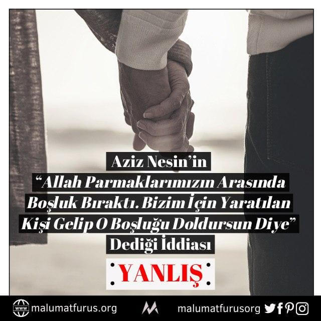 “Allah parmaklarımızın arasında boşluk bıraktı. Bizim için yaratılan kişi gelip o boşluğu doldursun diye” sözü Aziz Nesin’e ait değildir. Aziz Nesin’in dine bakış açısıyla bu söz uyuşmamaktadır. Bahse konu sözün 2010 yılında ilk kez sanal dünyada paylaşılmasından bir süre sonra Aziz Nesin’e atfedilir hâle geldiği anlaşılmaktadır.
