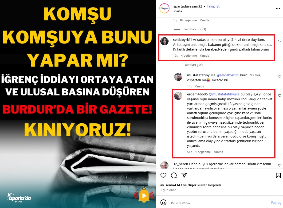 Kaymakamlığın tekzibinin ardından konuyla ilgili görüştüğümüz Isparta ve Burdur’dan yerel basınından bazı kaynaklar hazırlanan haberin gerçek olduğunu, 5-6 ay önce Şarkikaraağaç’ta bir köyde yaşandığını, yerel halkın konunun farkında olduğunu, tarafların konunun takipçisi olmadığını, açıklamayla da olayın örtbas edildiğini söyledi.