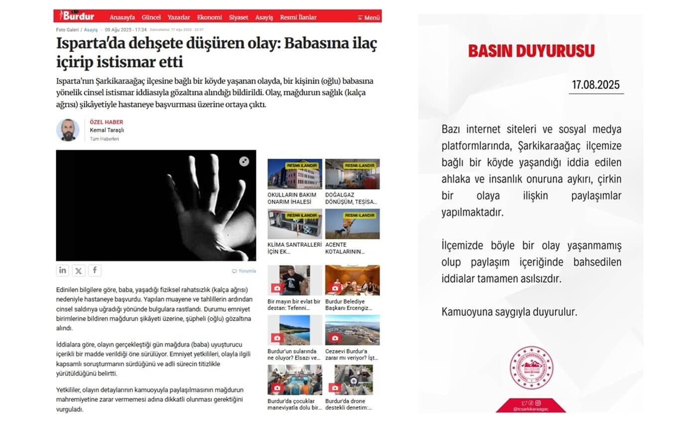 “Bazı internet siteleri ve sosyal medya platformlarında, Şarkikaraağaç ilçemize bağlı bir köyde yaşandığı iddia edilen ahlaka ve insanlık onuruna aykırı, çirkin bir olaya ilişkin paylaşımlar yapılmaktadır.