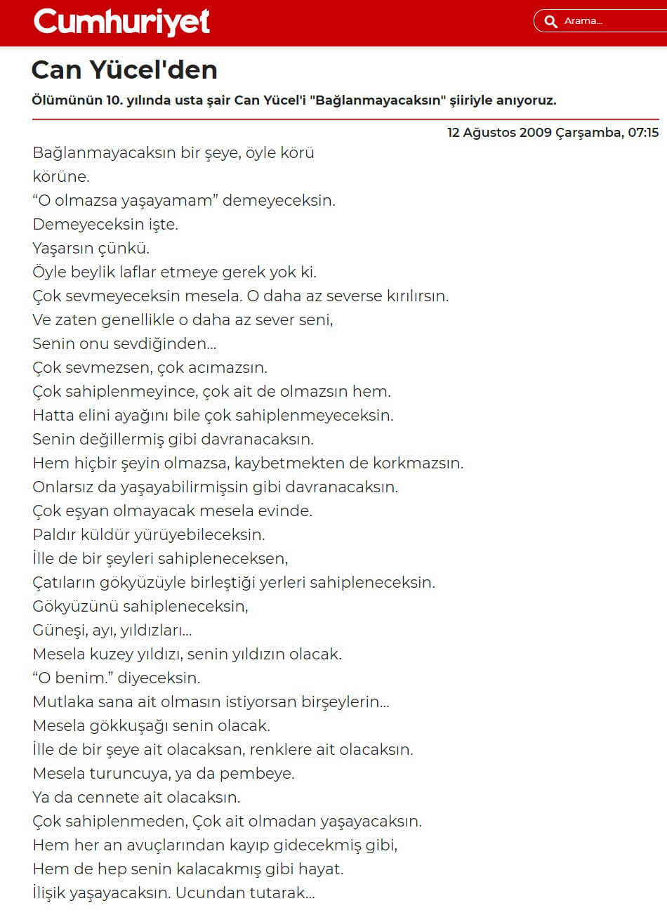 Şu son mecburi internet sondajında gördüm ki beğeneni çok olanın sahibi de bol oluyor. Hakkın olmayan üzerinde hak iddia etmek galiba yanlış bir şey. Ben bu alanda çok bilgili değilim, ama çok bilgili bir arkadaşım duruma el attı. Yazıyı nüfusuna geçirmek, klip çekmek, “Can Baba’nın şiiri” diye paylaşmak isteyenlerle paylaşayım istedim.”