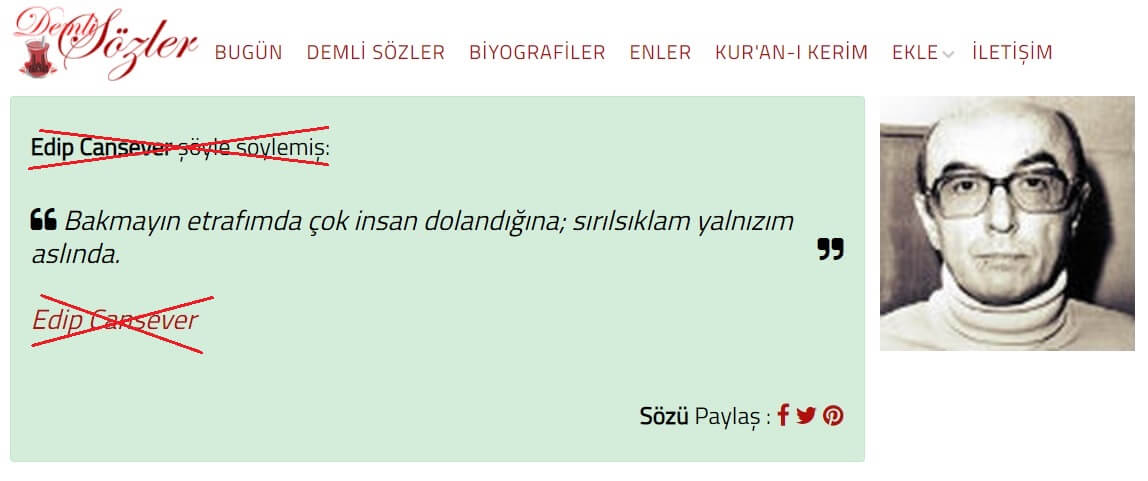 Kime ait olduğu henüz tespit edilemeyen bu sözün Edip Cansever’le hiçbir alakası bulunmuyor.