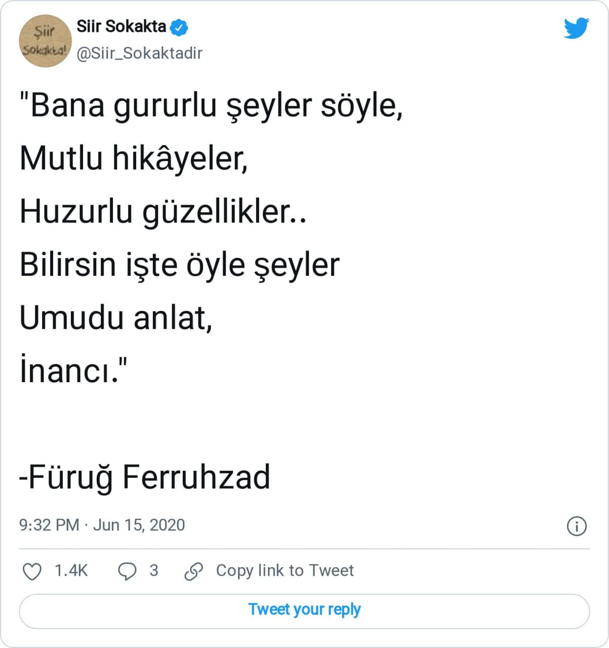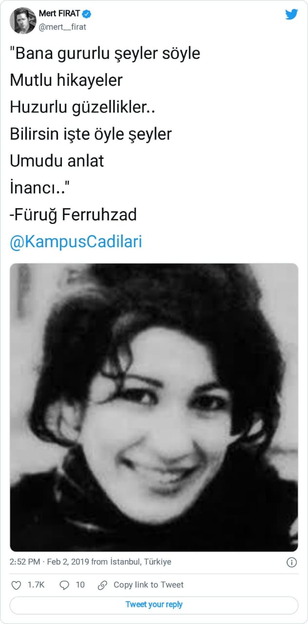Bugünkü yazımızda, sosyal medyada sıklıkla ünlü şair Füruğ Ferruhzâd (1935-1967) imzasıyla paylaşıldığına şahit olduğumuz “Bana gururlu şeyler söyle / Mutlu hikayeler / Huzurlu güzellikler / Bilirsin işte öyle şeyler / Umudu anlat / İnancı” dizelerinin peşine düşeceğiz.