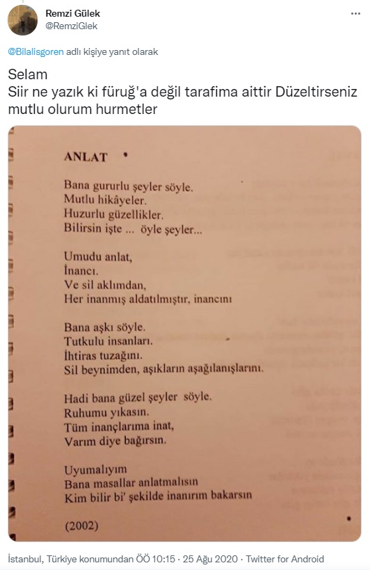 Sosyal medyada mezkûr dizelerin kendisine ait olduğunu belirten Remzi Gülek, kendisiyle yaptığımız görüşmede şiirin şahsına ait olduğunu, 2002 yılında kaleme aldığı “Anlat” adlı şiiri içine sinmediği için ilk şiir kitabında yer vermediğini, önümüzdeki günlerde çıkacak olan Çatlak Kadeh adlı ikinci şiir kitabında mezkûr şiire yer vereceğini aktardı.