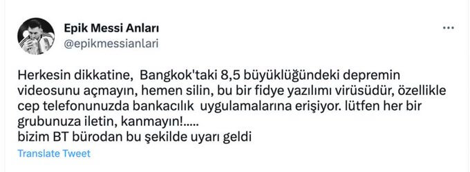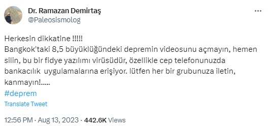 Tolga Özçelik: “ÖNEMLİ Herkesin dikkatine, Bangkok’taki 8,5 büyüklüğündeki depremin videosunu açmayın, hemen silin, bu bir fidye yazılımı virüsüdür, özellikle cep telefonunuzda bankacılık uygulamalarına erişiyor. lütfen her bir grubunuza iletin, kanmayın bizim BT bürodan bu şekilde uyarı geldi”